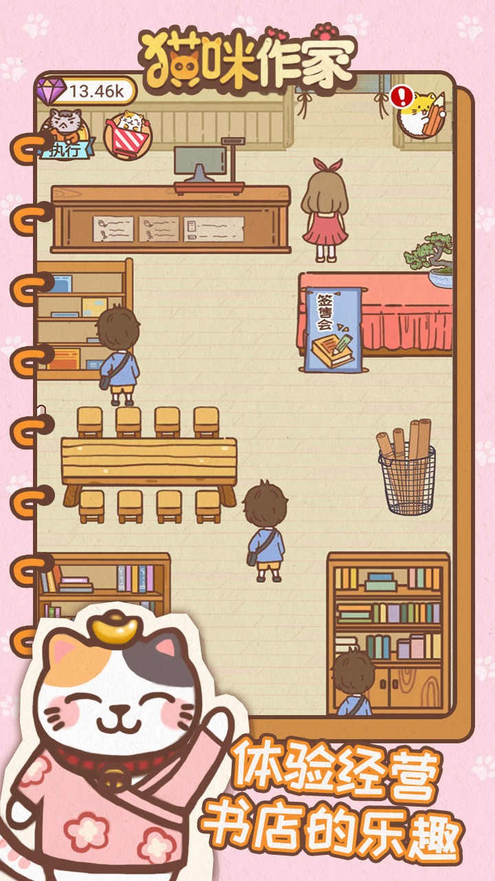 猫咪作家免广告版是一款萌趣的猫咪养成经营玩法,在猫咪作家免广告版中,玩家可以收集各式各样的小猫咪,因为这里有很多猫咪作家,所以你要和猫咪们一起经营这家书店,并且还要提供给猫咪们写作的地方