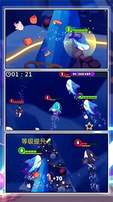 3.通过收集宝藏获得更好的武器和装备,提升你的战斗能力,轻松击败其他鱼类,获得更多能量。
