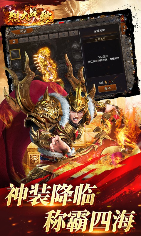 烈火战歌是一款经典传奇RPG手游,烈火战歌为单职业打金手游,在游戏中玩家可以享受高攻速、刀刀切割、刀刀冰冻的效果,打金高爆率,所有装备全部靠打就能得,高级装扮无需购买可以免费领取