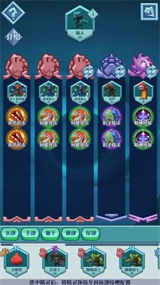 1.在游戏中进行战斗冒险,完成挑战收集不同的精灵,通过精灵融合学习各种自由技能卡,进行战斗。