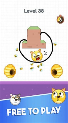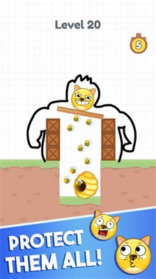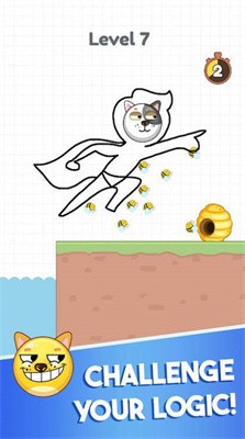 1.在关卡中进行画线挑战,一笔画出不同的形状,保护狗狗,顺利撑过倒计时,完成关卡任务。