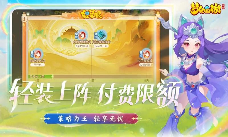 西行减负,轻松启程!轻享服等级上限锁定69级,超额经验可安全累积无衰减!核心养成仅开放法宝、经脉、召唤灵装备系统,召唤灵限65级以下及3只精选神兽,助您轻装上阵,畅享回合乐趣!
