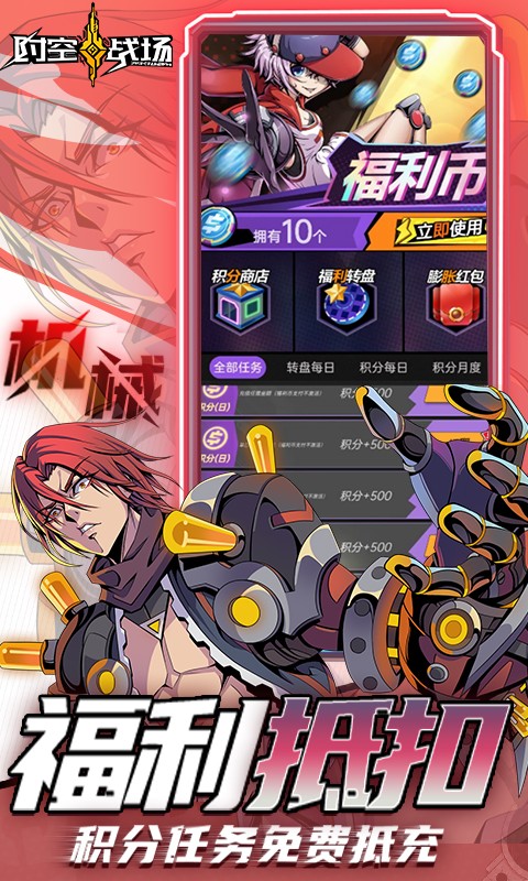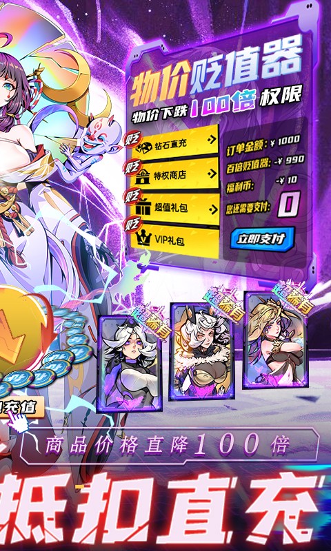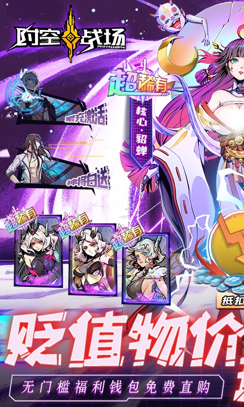 时空战场送百倍贬值器是一款二次元科幻卡牌手游,在时空战场送百倍贬值器中,有超多高颜值英雄角色可供玩家选择,玩家上线就送VIP12和百倍贬值器,还有充值权限可以用内置福利币免费购买,登录就有极品核心英雄和万元红包