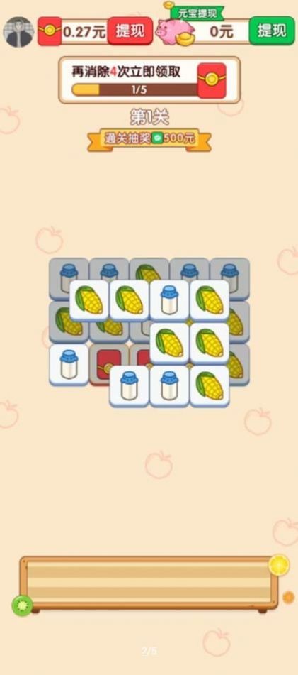 水了个果是一款消除小游戏可以领红包,通过堆叠消除的玩法每过一关都有红包拿,而且在闯关过程中完成一定次数的消除也能获得红包奖励,在游戏中每次通关或是观看广告除了红包还有大量元宝,元宝也是可以提现的