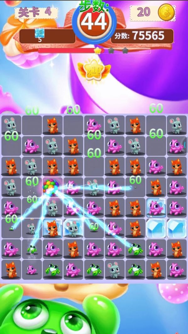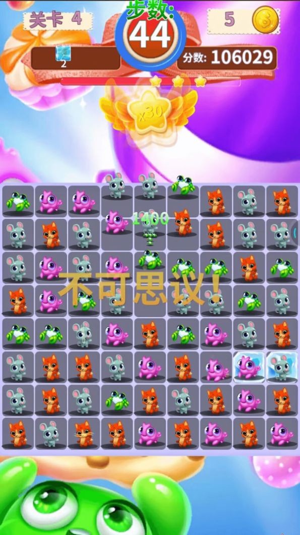 1.卡通风格的消除小游戏,在游戏中有很多的可爱的小动物作为消除对象