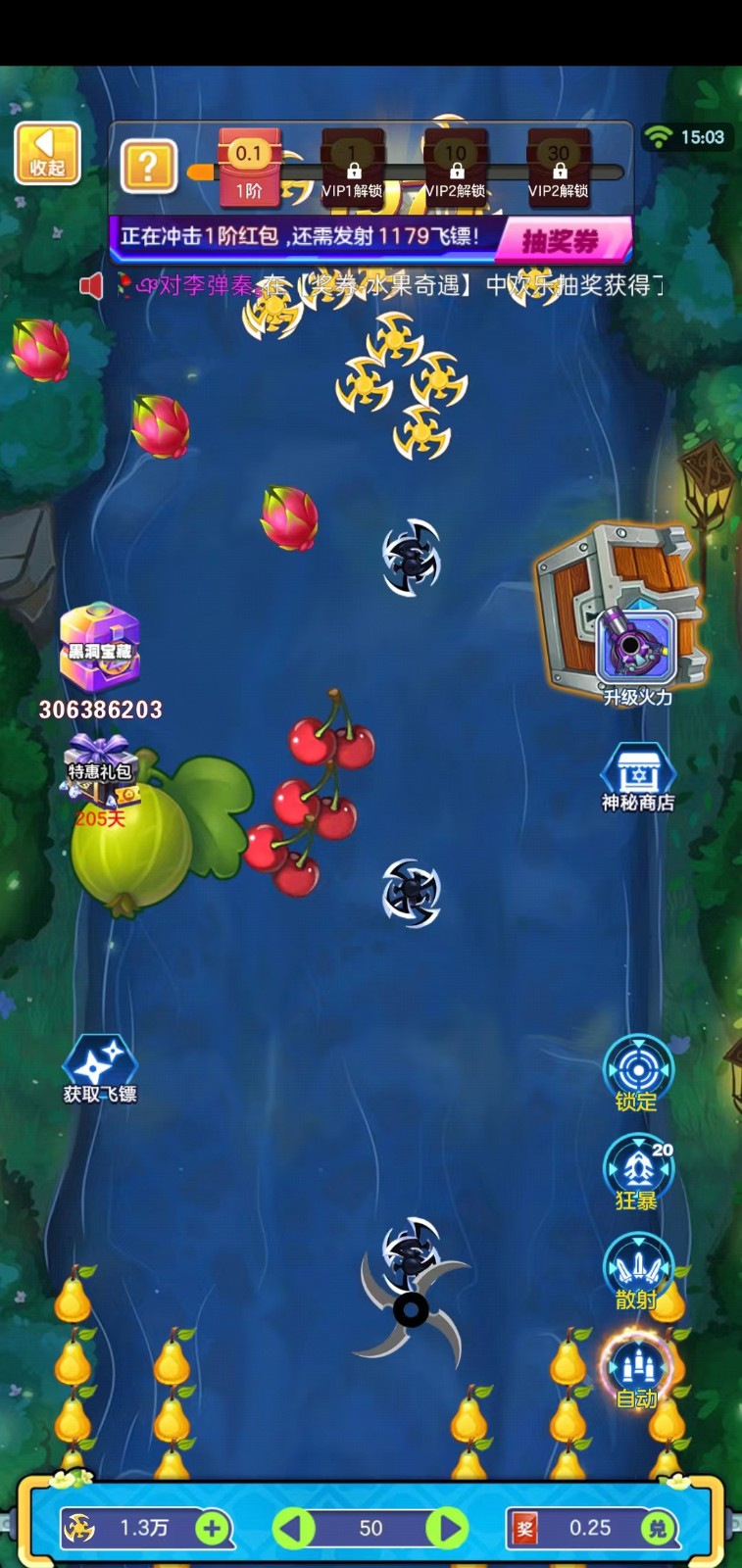 水果777大奖版是一款飞镖射击小游戏,在水果777大奖版中,玩家可以发射飞镖来射击水果,消耗指定数量的飞镖子弹就可以获得红包奖励,消耗的越多得到的红包就越多,达到指定兑换数额就可以兑换红包提现