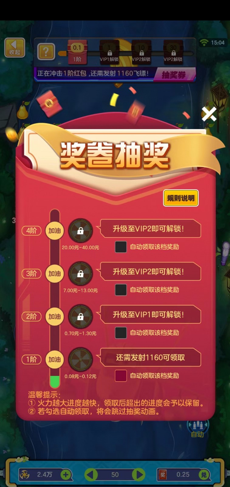 1.消耗指定数量的飞镖来获取红包奖励,达到指定阶段就可以获得红包