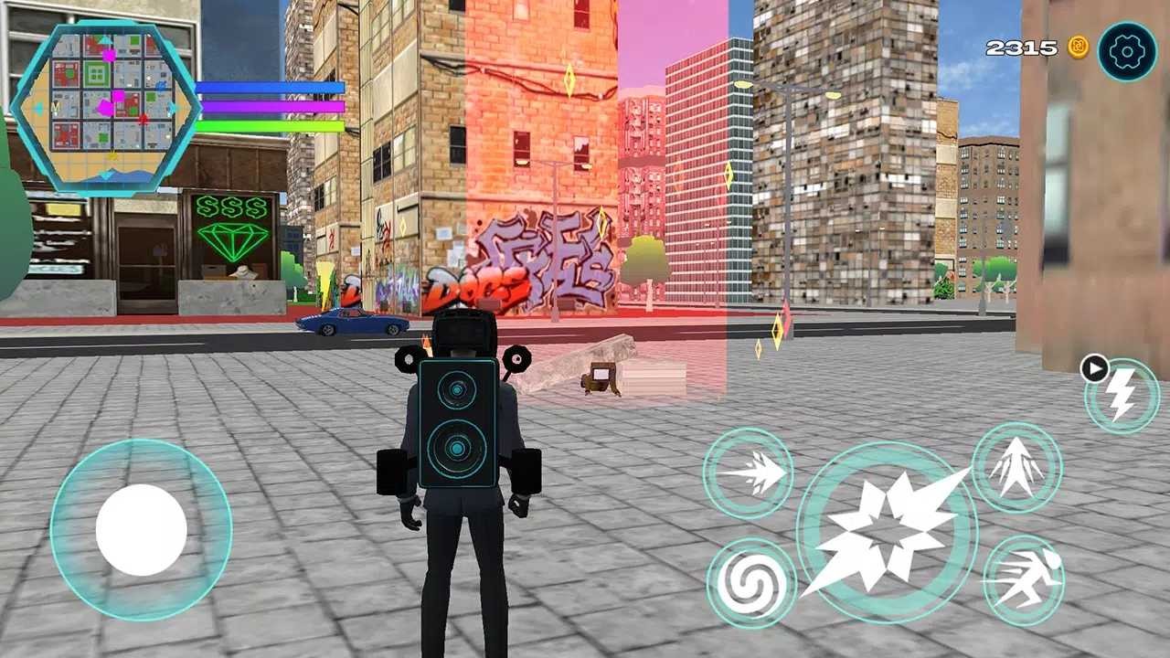 卡梅拉VS斯基比德是一款根据马桶人VS监控人改编的冒险rpg游戏,但与之不同的是,其中的监控人换成了音响人,而玩家将作为音响人进行冒险探索,开放城市地图可以任意冒险,在这里与邪恶的马桶人斗争