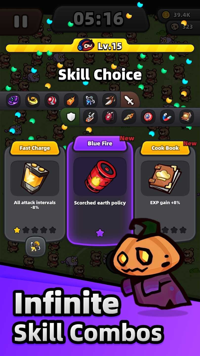 2.在对战升级会获得随机技能,通过随机技能组合可以获得不同的战斗效果