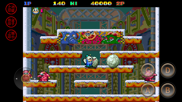 雪人兄弟街机版是一款FC《雪人兄弟》移植版,雪人兄弟街机版复刻了原版游戏的玩法内容,各种关卡机制全部保留,每一关都有不同的挑战,而且还有药水的加成和滚雪球机制,经典复古好玩