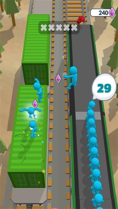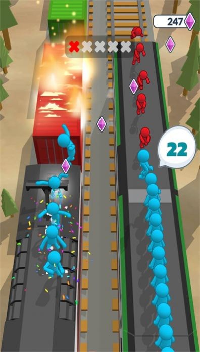 僵尸列车大逃亡,一款休闲解压的冒险游戏。在僵尸列车大逃亡游戏中玩家可以控制自己的队伍,在地图开启冒险,招募更多的火柴人来组成长队,这里的陷阱有很多,而且红色的都是僵尸,利用列车顶部提供的道路,来完成你的逃亡。