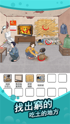 最后三个有点难度,我们要打开床头柜的抽屉找到收据,然后找到枕头下方回家的票,最后把画面移到右侧,点击门外的挖掘机