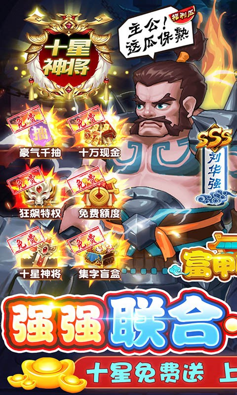 三国豪杰齐聚,2023年最值得祈祷的 三国卡牌手游《富甲萌国》强势来袭,策划诚心之作,福利超级加倍,剧情原汁原味,让你身临其境的体验战火纷飞,狼烟四起的三国时代。现在来玩,上线就送10万现金券和神级盘古套装,登录豪礼送2000抽,强哥豪礼送10星高启强和刘华强,助力主公沙场驰骋。