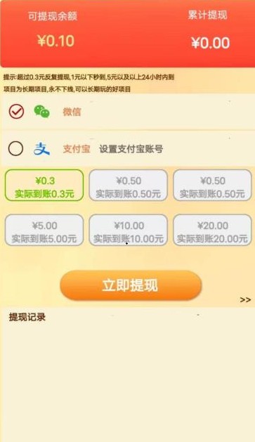 每天在线都可以领取大量的红包奖励,无论是经营还是邀请都是可以提现的红包,而且游戏不仅支持双线提现,还可以选择微信或者支付宝进行提现,绑定实名账户就可以到账