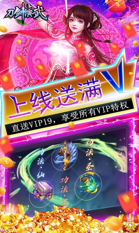 刀剑演武0.1折无限充是一款动作武侠养成游戏,在刀剑演武0.1折无限充中,玩家上线就有满级VIP特权,直接享受VIP19所有特权福利,每次升级有大量的升级材料和功法光武,七日登录每天都送充值卡