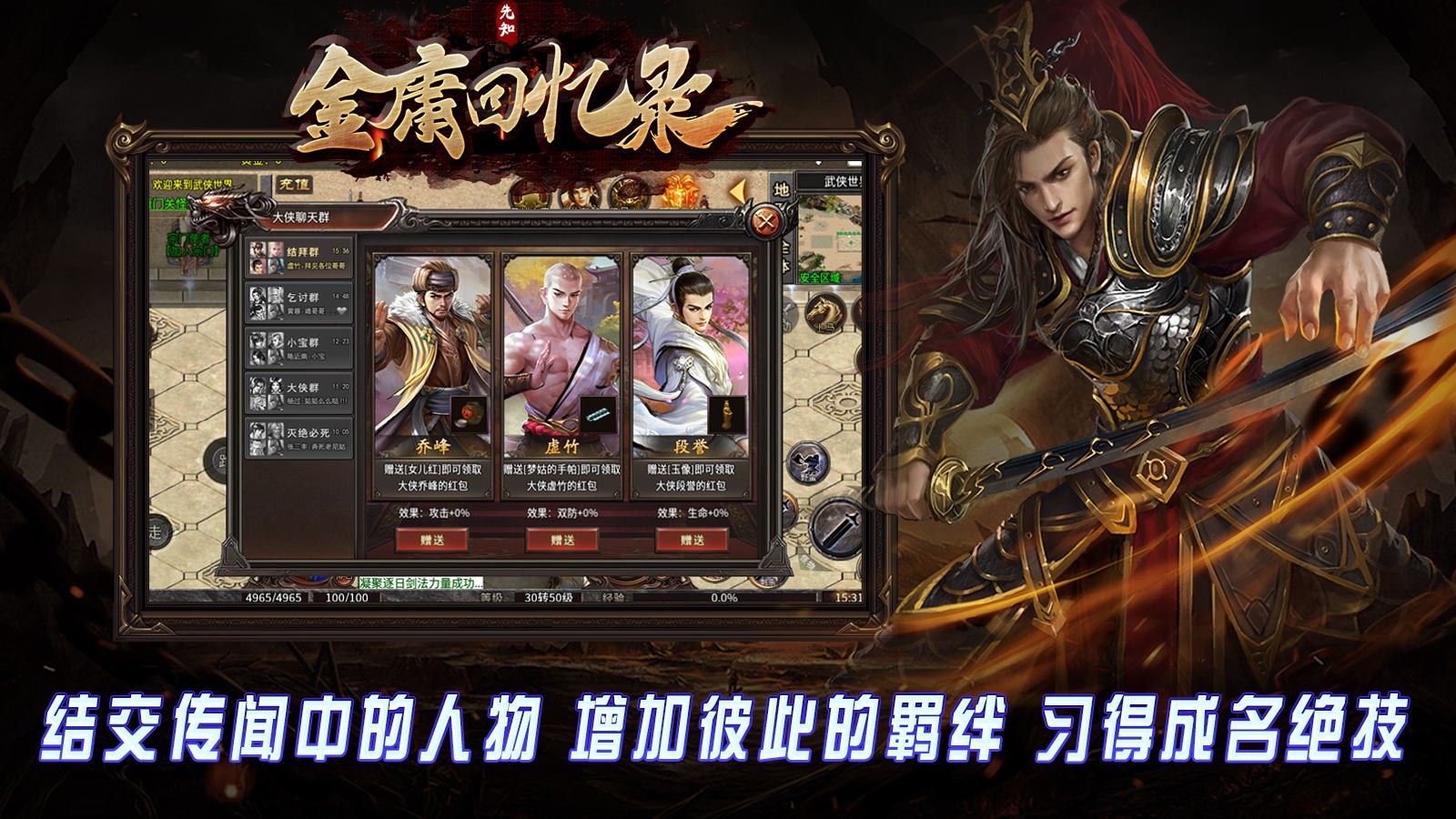 先知金庸回忆录手游是一款武侠冒险题材手机传奇游戏,在先知金庸回忆录手游内玩家将进入到武侠的世界,经典的传奇玩法进行改编,在这里探索我们的武林世界之中,加入到竞技场,成功的赢取我们的胜利!