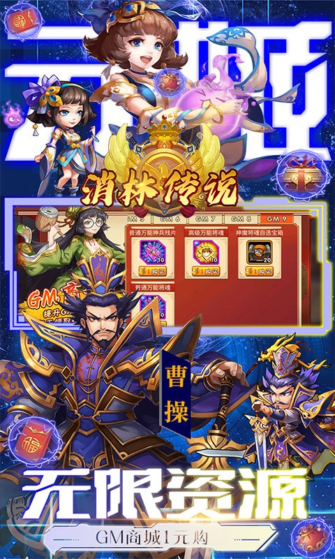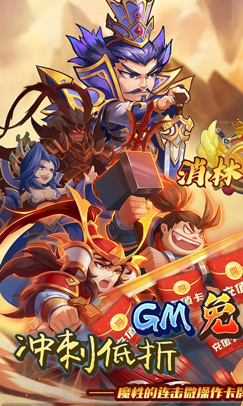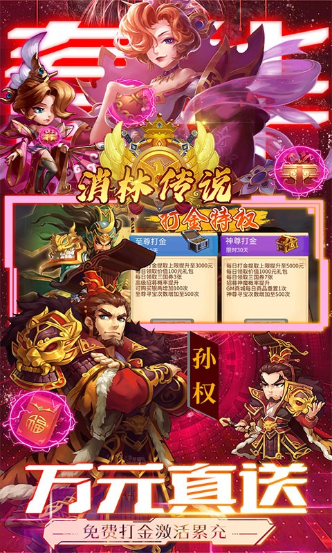 消林传说首续0.1折是一款三国策略卡牌手游,在消林传说首续0.1折中,玩家登录就送满级VIP,还有328充值卡和海量资源可以免费领取,GM工具免费送1000额度,可以免费充值激活特权活动,还有无限资源免费送,扫荡还送真充卡