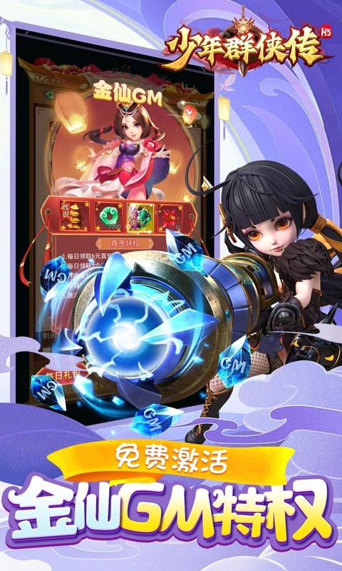 《少年群侠传H5》这款游戏给你一个从未体验过的仙侠世界,不一样的玩法,超绚丽的技能,丰富的即时操作,配合各具特色的英雄大招及灵活自由的战斗策略,让玩家在战斗中创造出无限可能! 更有 Q宠乱斗、萌妹护驾、个性时装、百种法宝与技能,任你自由搭配,还可以结缘双修、生儿育女、开宗立派、斩妖除魔、渡劫飞仙,在好友见证下登基为天帝! 上线福利:金仙GM特权,无级别神装10件套。满级VIP,一键领取50个VIP礼包。 后缀福利说明:内置零钱充刷器