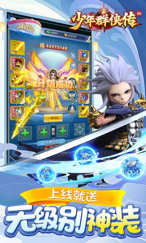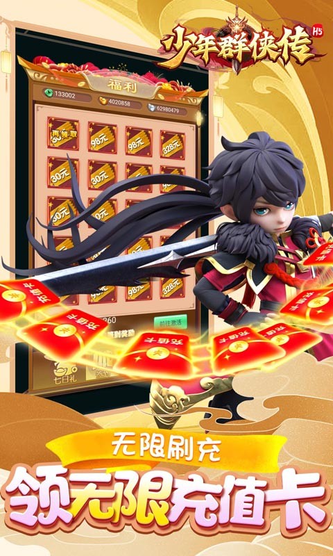 少年群侠传H5零钱充刷器是一款动作仙侠手游,在少年群侠传H5零钱充刷器中,玩家上线就送GM和VIP特权,还有无级别神装十件套可以免费领取,零钱刷充三大至尊卡全部免费激活,累计在线30分钟送冰原女神绝版时装