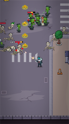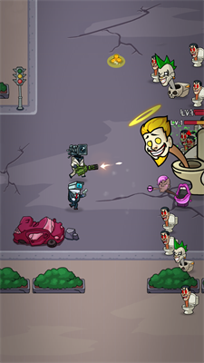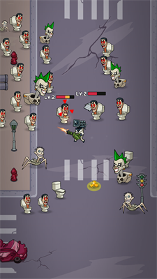 1.控制角色在场景中灵活走位,自动射击,击败来袭的马桶人,获得金币不断升级,解锁更多的武器。