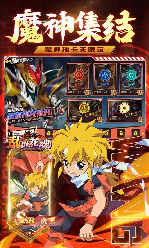 乱世龙魂魔神英雄无限充是一款动漫卡牌回合制手游,在乱世龙魂魔神英雄无限充中,玩家上线就送千元充值券和VIP4,每日在线30分钟还能领取百万充值券,闯关就送一千连抽,登录就送凤凰龙神丸、六星虹玉、金色战王丸