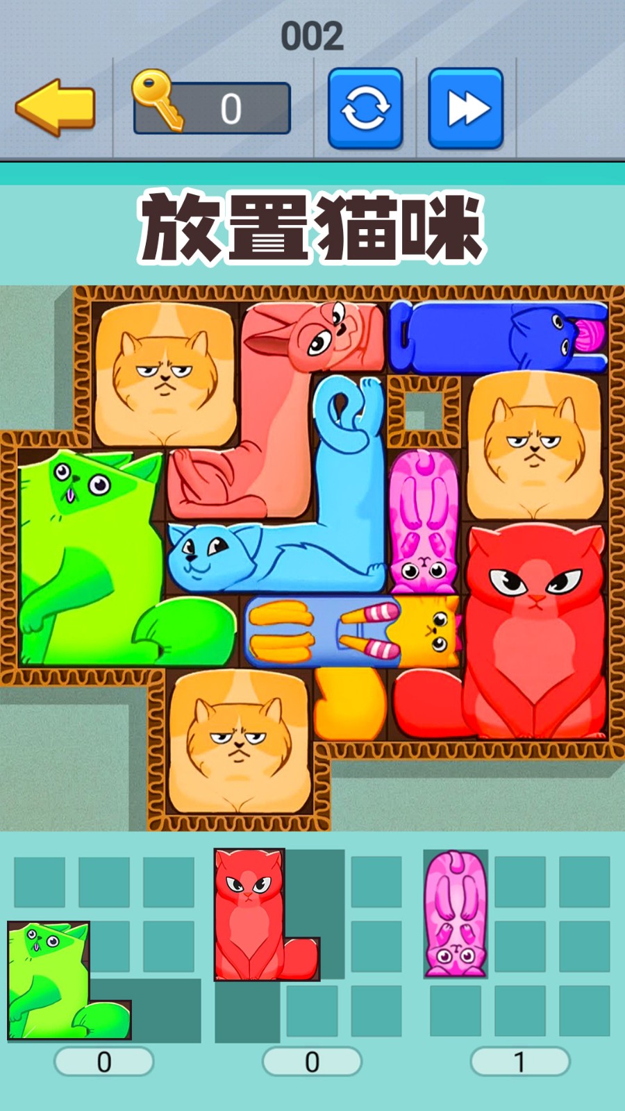 喵咪挤一挤是一款休闲类型的闯关游戏。在喵咪挤一挤中有非常多奇形怪状的猫咪出现,玩家只需要将它们放置在合适的位置,将所有的猫咪都放置到同一空间就能顺利完成关卡,获得更多的游戏快乐,还能收获道具。