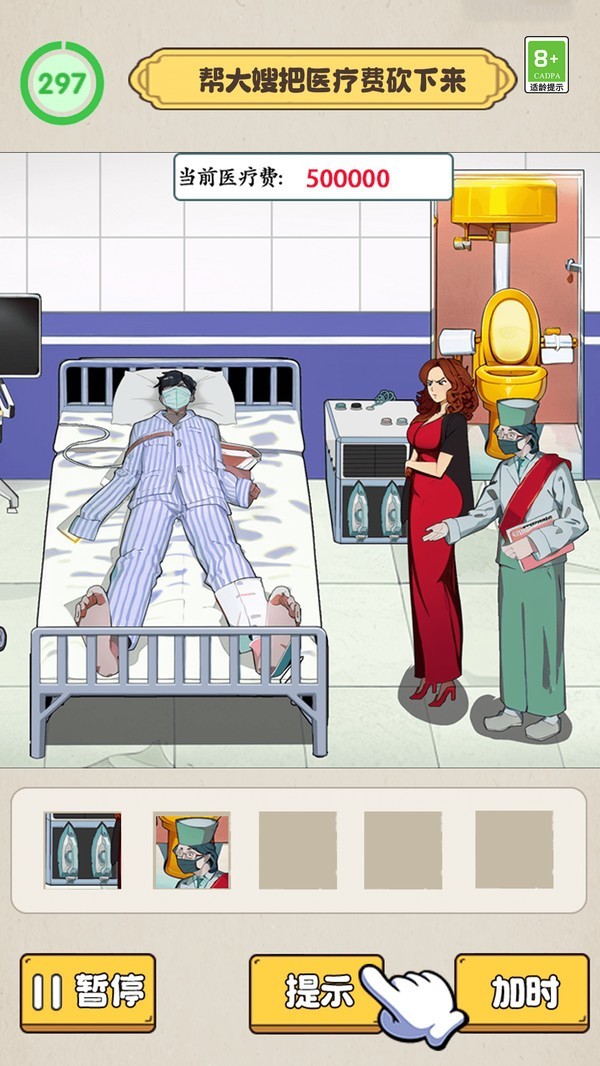 玩家如果在游戏中卡关了,就可以利用提示或者加时来帮助你解决问题,如果完成不了任务,就可以先暂停下。单机游戏,没有广告。