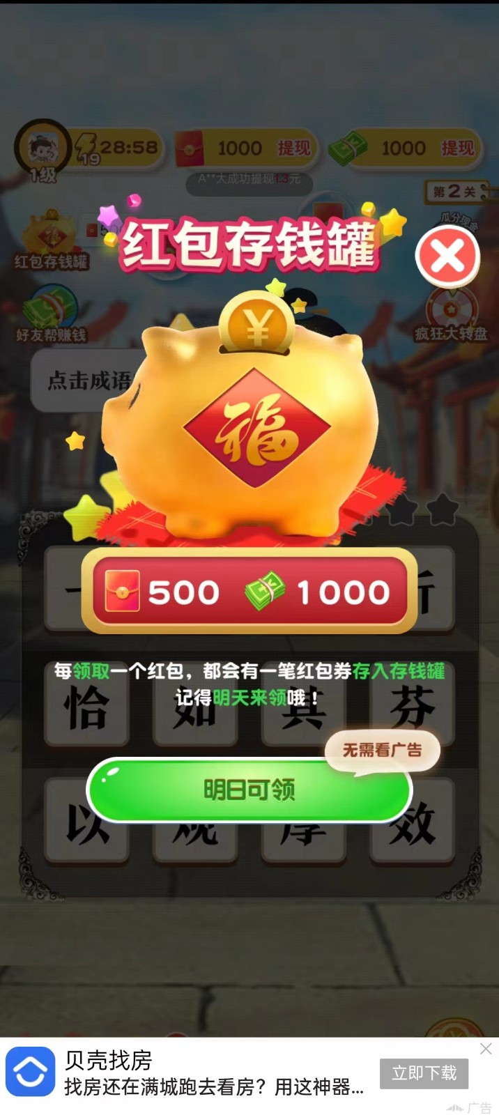 2.观看广告可以参与开宝箱、转盘奖励等,都可以获得随机红包,还能在存钱罐中存入第二天可以直接领取的红包