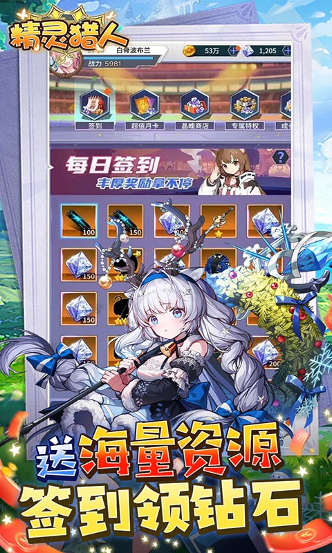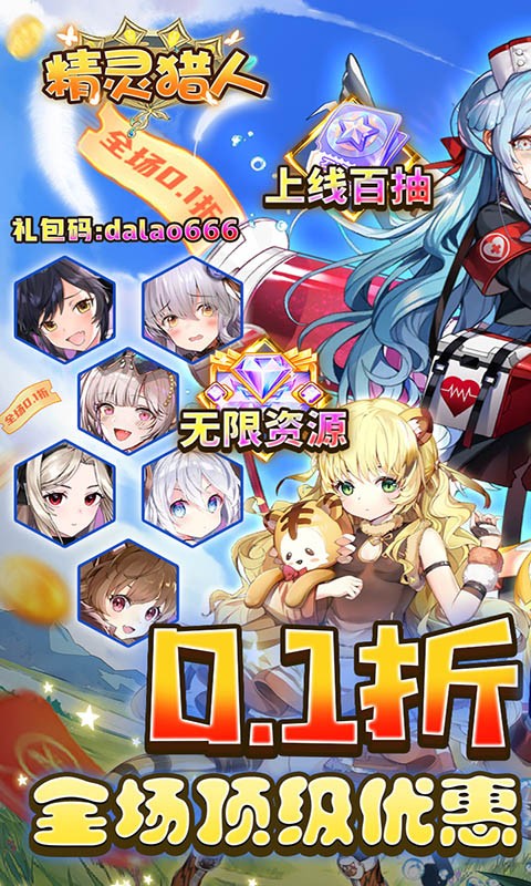 精灵猎人0.1折是一款二次元动漫卡牌手游,在精灵猎人0.1折中,玩家上线就可以领取百连抽福利和6星核心幻兽,每日签到还送大量钻石、突破材料和其他养成资源,输入礼包码dalao666和dalao888即可领取开局福利