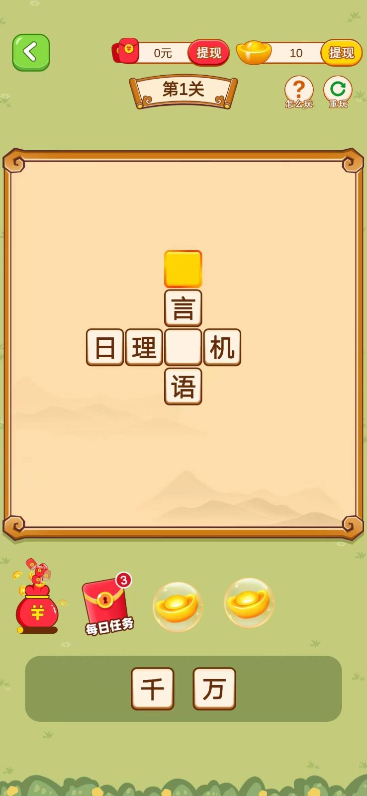1.完成成语填字闯关,保证相连的成语全部正确即可通关领红包