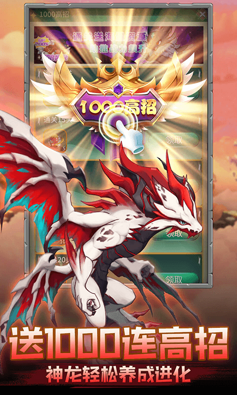 神兽连萌破底0.1送20星魔龙是一款魔幻放置卡牌养成游戏,在神兽连萌破底0.1送20星魔龙中,玩家上线就送VIP12和万元充值卡,还有大量钻石、金币、代币等可以领取,活动免费赠送20星魔龙,通关还送1000连抽