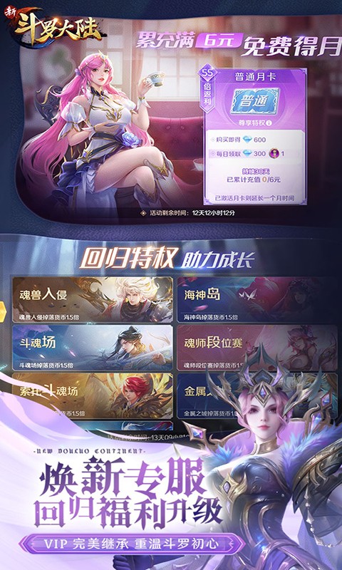 新斗罗大陆登录送SSS魂师是全新斗罗大陆手游,新斗罗大陆登录送SSS魂师全新升级,高度还原动漫剧情和场景角色,玩家上线就送100连抽,三日登录送唐三经典皮肤,八日登录送SSS戴沐白,开服前七日还有天降红包活动