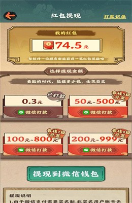 首先就是红包提现,需要客栈等级达标,一级客栈最低一毛最高10元,大家提到多少了呢?是不是也是几毛钱打发了,想再赚钱就需要客栈到5级,此时就别奢求500了,其实连50都没有。