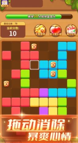 1.在方块滑动消除关卡中完成指定方块的拖动,达成分数即可成功通关领红包