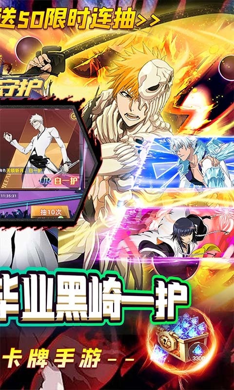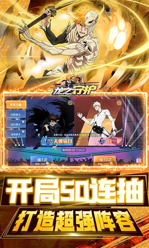 龙之守护送毕业黑崎一护是一款经典动漫卡牌手游,在龙之守护送毕业黑崎一护中,高度还原死神动漫剧情和角色, 华丽招式享受真实的打击画面,玩家上线就送毕业满星黑崎一护假面,开局直升VIP5,完成任务送大量环、魂珠,升级材料等道具