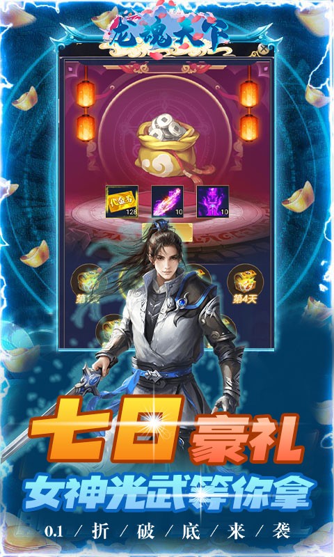 龙魂天下首续0.1折是一款挂机福利仙侠手游,在龙魂天下首续0.1折中,玩家上线就能领取998的代金券和1w功法卷轴,还有万抽助你战力飙升,创角就送至尊VIP激活卡,签到、登录、在线还有大量充值卡可以免费领