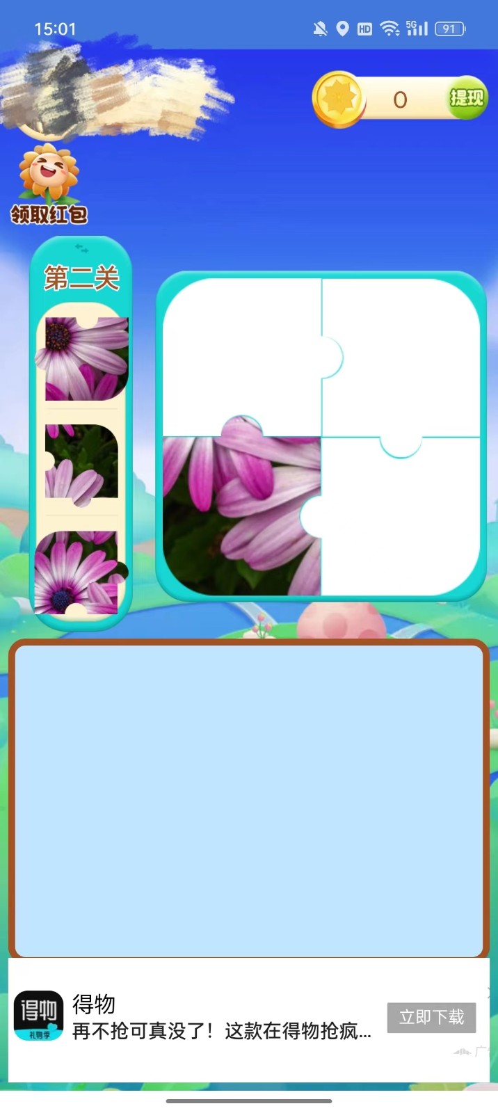2.点击拼图上方的领取红包向日葵,观看广告之后就可以领取金币奖励