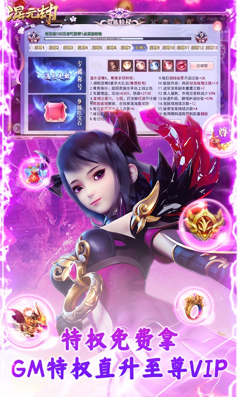 混元劫GM扶持版是一款仙侠MMO挂机手游,玩家上线就能免费激活至尊VIP5,还有千元充值卡和GM装备可以领取,累登七天就送酷炫灵鲲和巨额充值卡,打副本还能爆充值,天天在线抽奖领真充