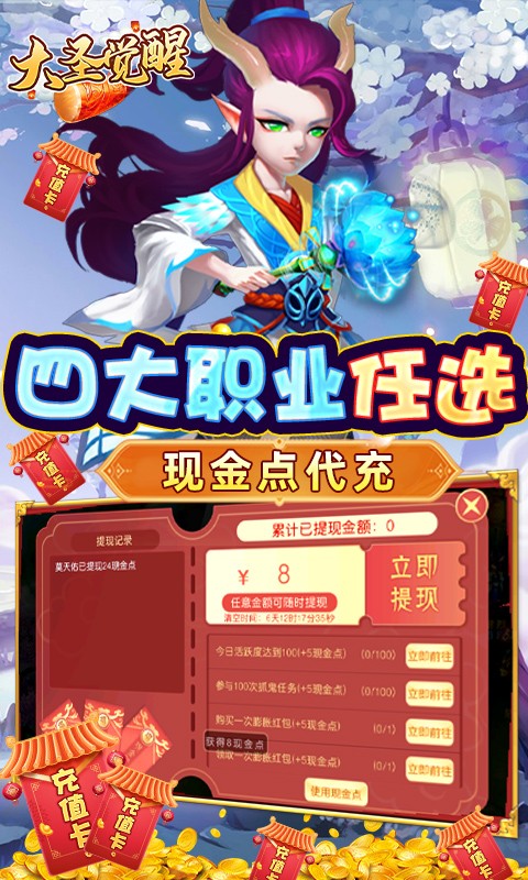 大圣觉醒送满觉剑魔是一款西游题材的策略回合制卡牌手游,在大圣觉醒送满觉剑魔中,玩家登录首日就送一万真充币,真充币可以用于充值活动,首充、累充都可以激活,每日上线还能白嫖现金点,做任务就能领满觉醒剑魔