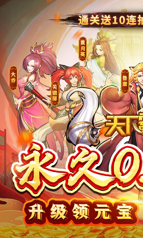 天下霸域永久0.1折是一款Q版挂机卡牌手游,在天下霸域永久0.1折玩家上线就送十连充,累登七天就送SS级武将,十五天还有五星SSS级神将可以领取,升到20级就送5星英雄随机包,轻松拥有强大阵容
