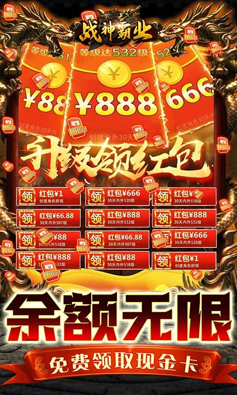战神霸业GM送充折扣服是一款高爆折扣福利传奇手游,在战神霸业GM送充折扣服玩家上线就送VIP15、100万元宝、豪华时装套,还能白嫖激活特权,每日领取大量现金卡和648真充卡,海量福利上线就能领取