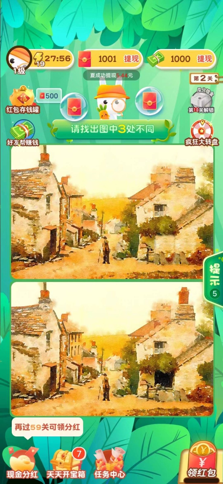 1.找出图中三个不同指出就可以成功通关领取关卡红包奖励,连续闯关可以参与现金分红