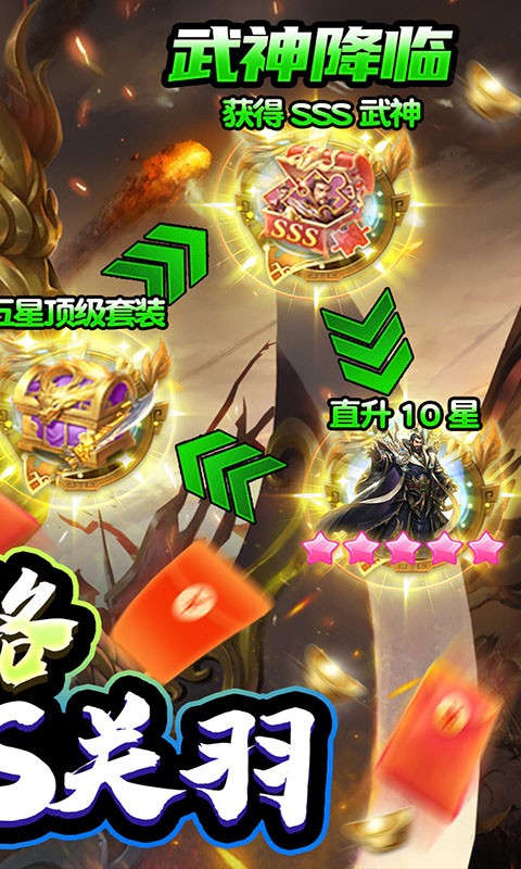 5、首个十连抽必保底出SSS5星将,【武神降临】活动直升10星送顶级装备,保送神将毕业