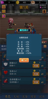 1.进入游戏开启冒险,角色会自动战斗,击败敌人可获得相应的金币奖励,对角色的基础属性进行升级。