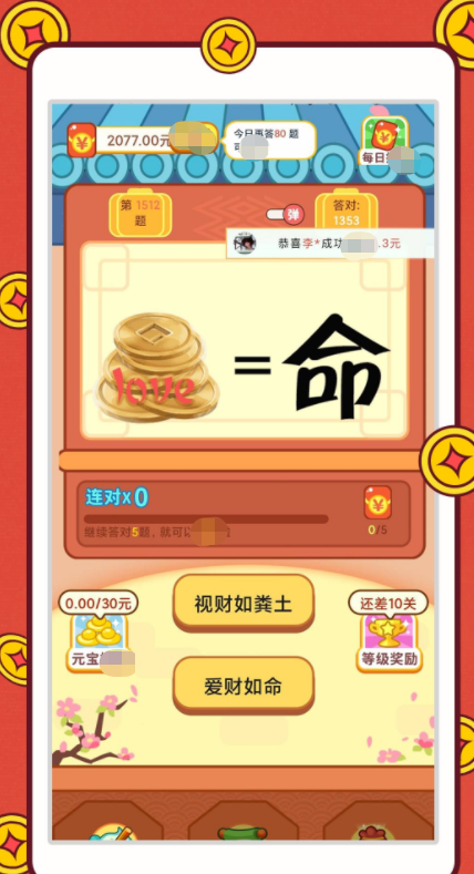 答题赚钱乐是一款可以赚钱的益智答题小游戏,在答题赚钱乐中,有很多有意思的看图猜题关卡可供玩家挑战,玩家要根据给出的图画来猜出正确的成语或是俚语,玩法有趣还能赚钱,每猜对一道题就能领取一个红包