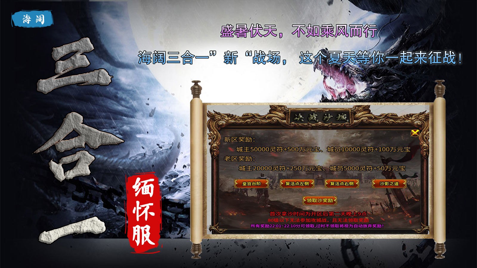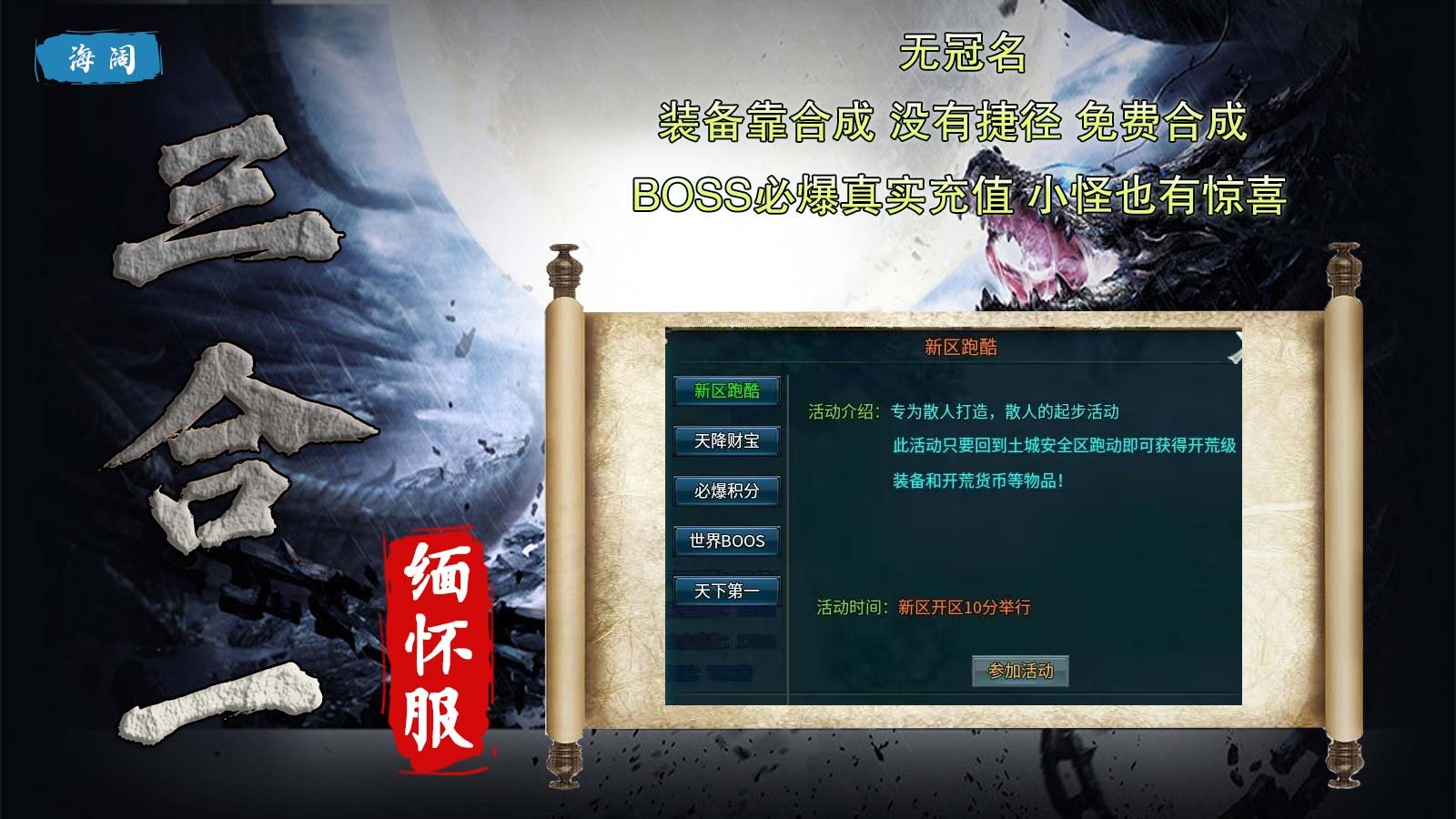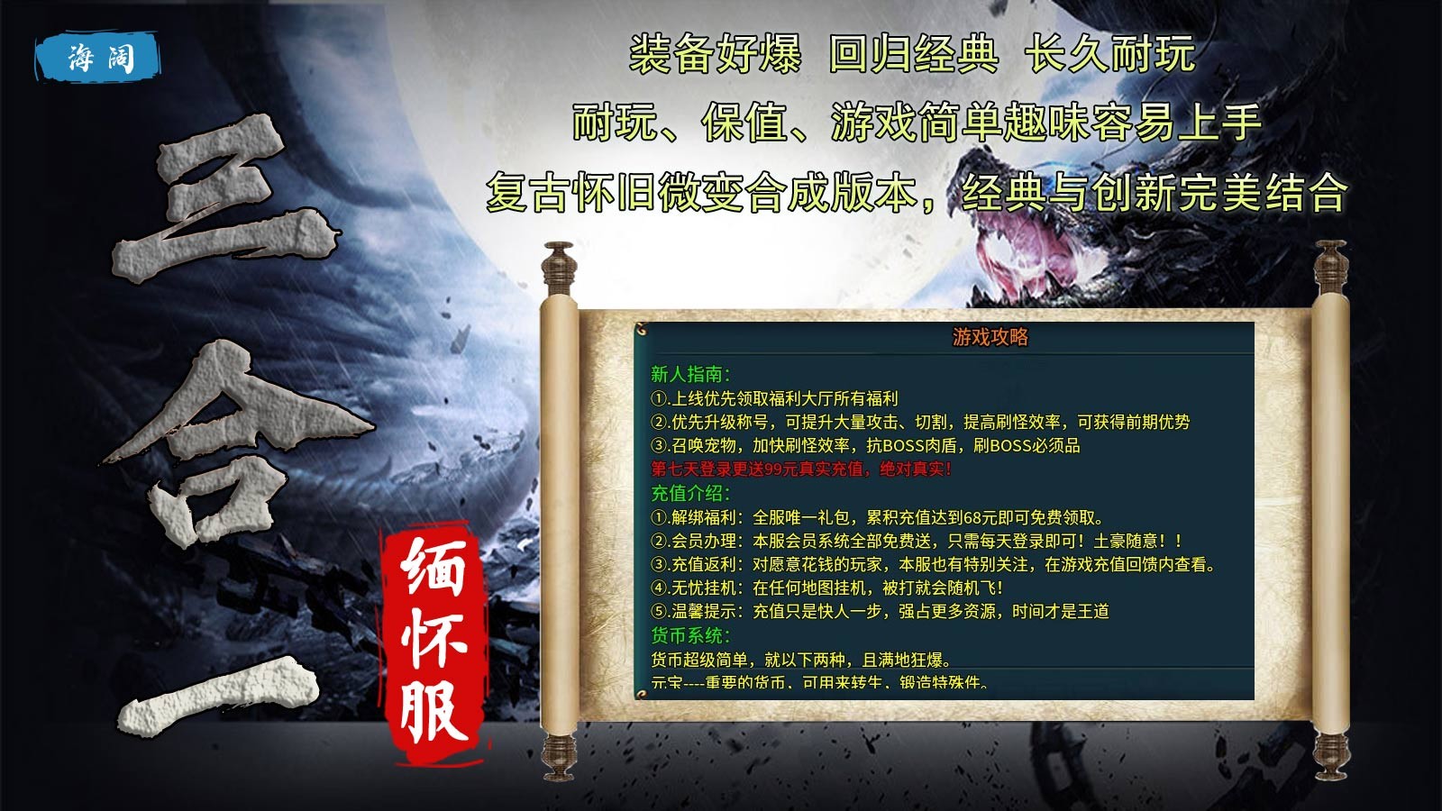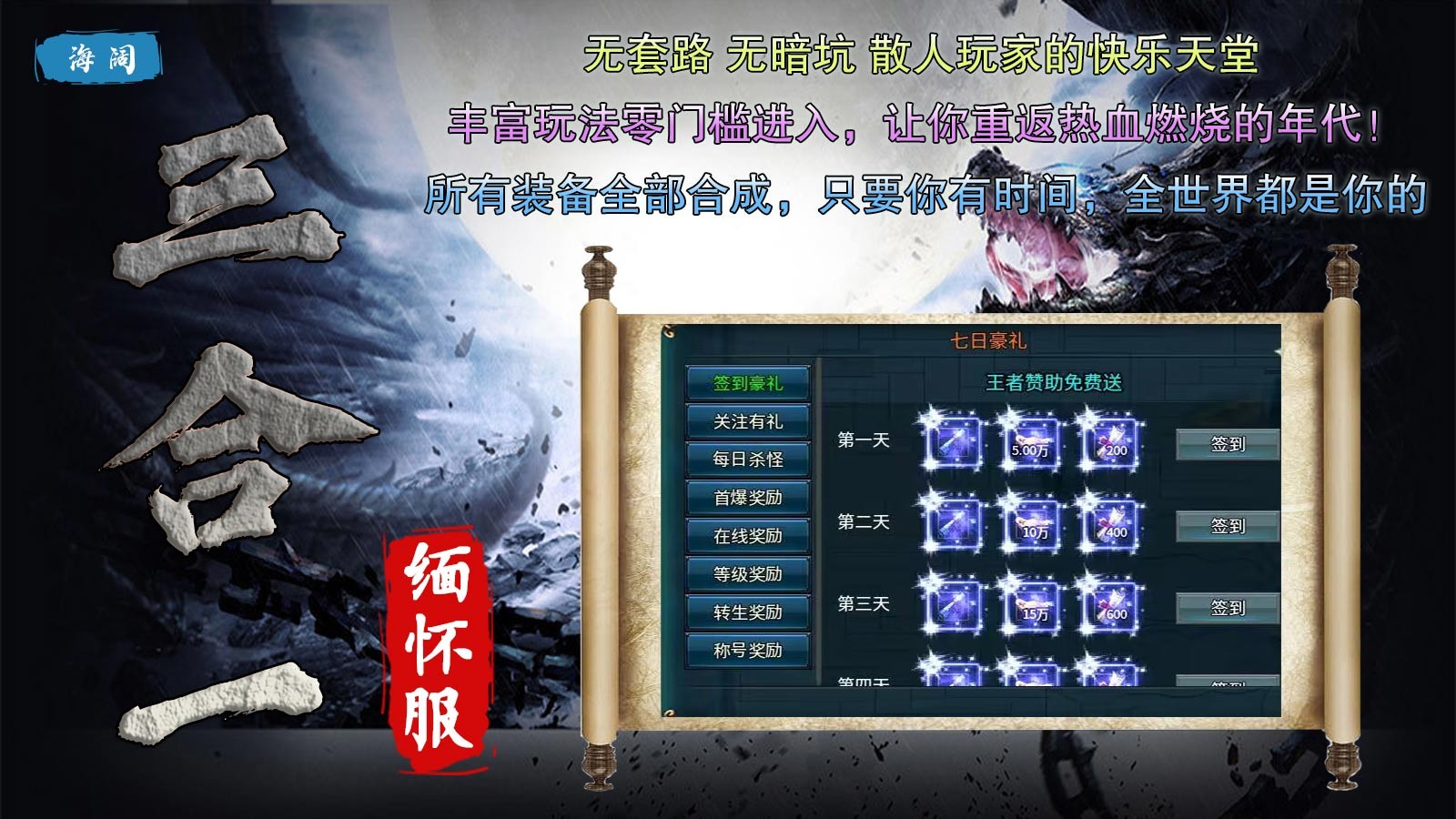 海阔三合一缅怀服是一款独家创作的185复古传奇手游,在海阔三合一缅怀服中,玩家上线就能领取豪礼,自动回收、自动合成、自动拾取全都送,七日登录还有99元充值可以免费内领取,福利活动丰富奖励丰厚