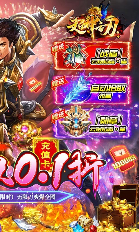 超神之刃内置0.1折超爽版是一款复古无限刀传奇手游,在超神之刃内置0.1折超爽版中,玩家上线就送自动回收和自动拾取,还有大量的道具装备可以领取,完成任务还送灵符,签到更有盲盒、实物等各种福利豪礼可以领