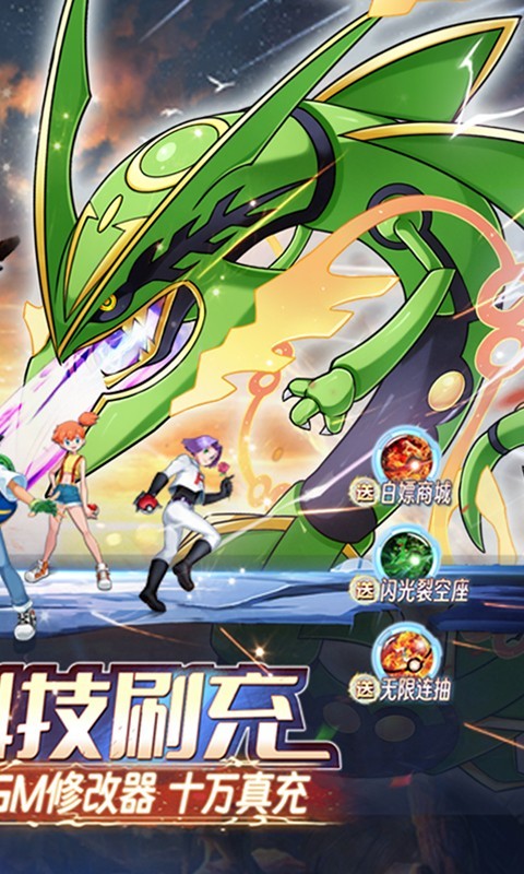 口袋大冒险Mega科技刷充是一款口袋妖怪题材的策略卡牌手游,在口袋大冒险Mega科技刷充中,玩家创角就送VIP10和闪光裂空座,还有无门槛刷充可以免费激活首充、基金、无限资源,在线就能免费领取十万真充,GM商城免费白嫖