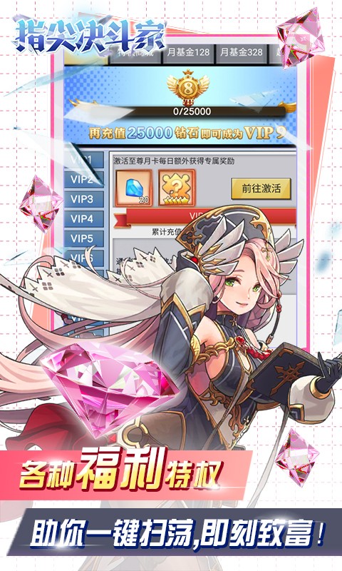 指尖决斗家0.1折暴爽是一款魔幻二次元卡牌手游,在指尖决斗家0.1折暴爽中,玩家上线就能领取VIP8和海量金币钻石,还有GM套装开局即可穿神装,免费GM卡可以提升GM权限,每日可以白嫖充值、材料
