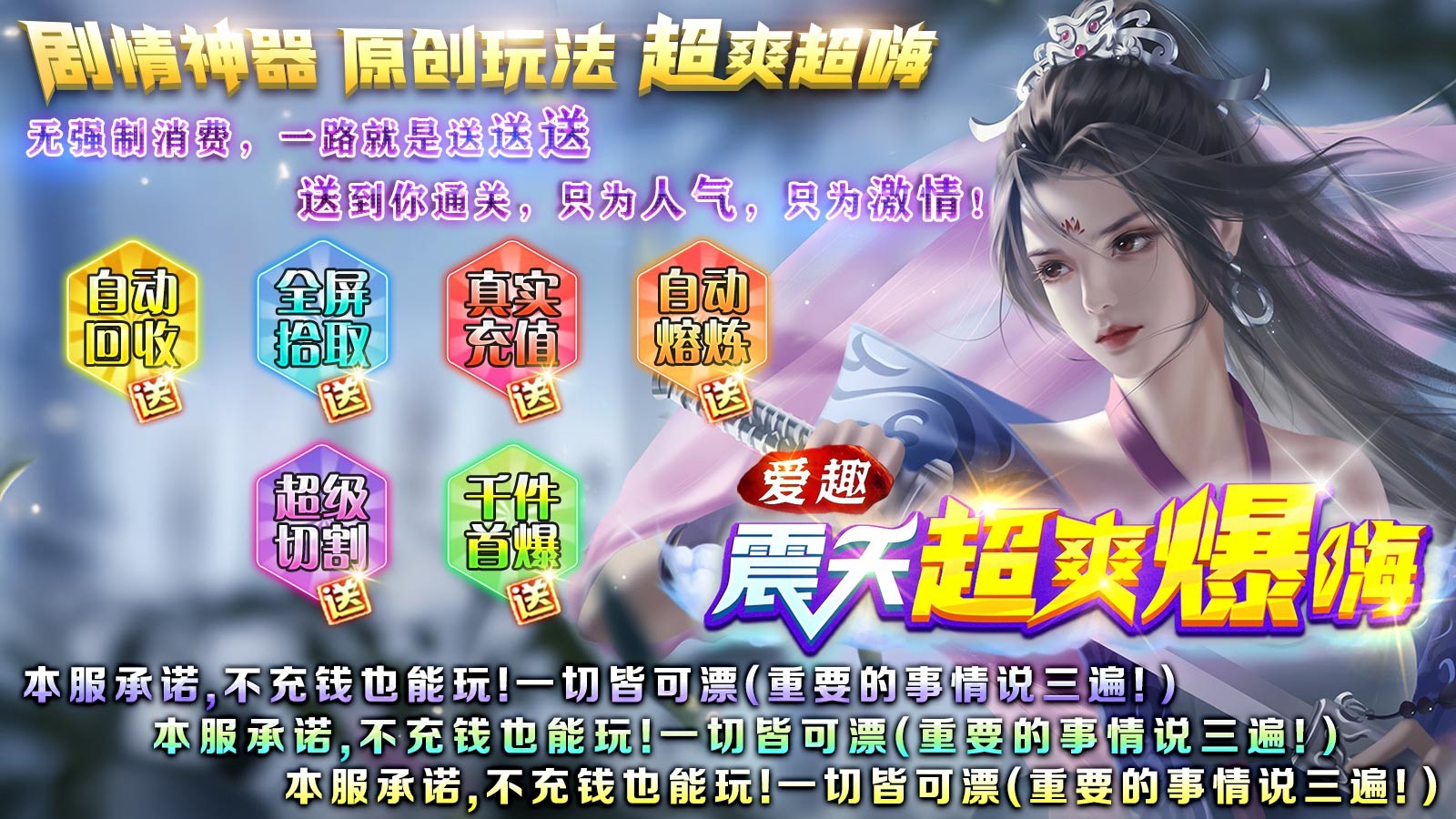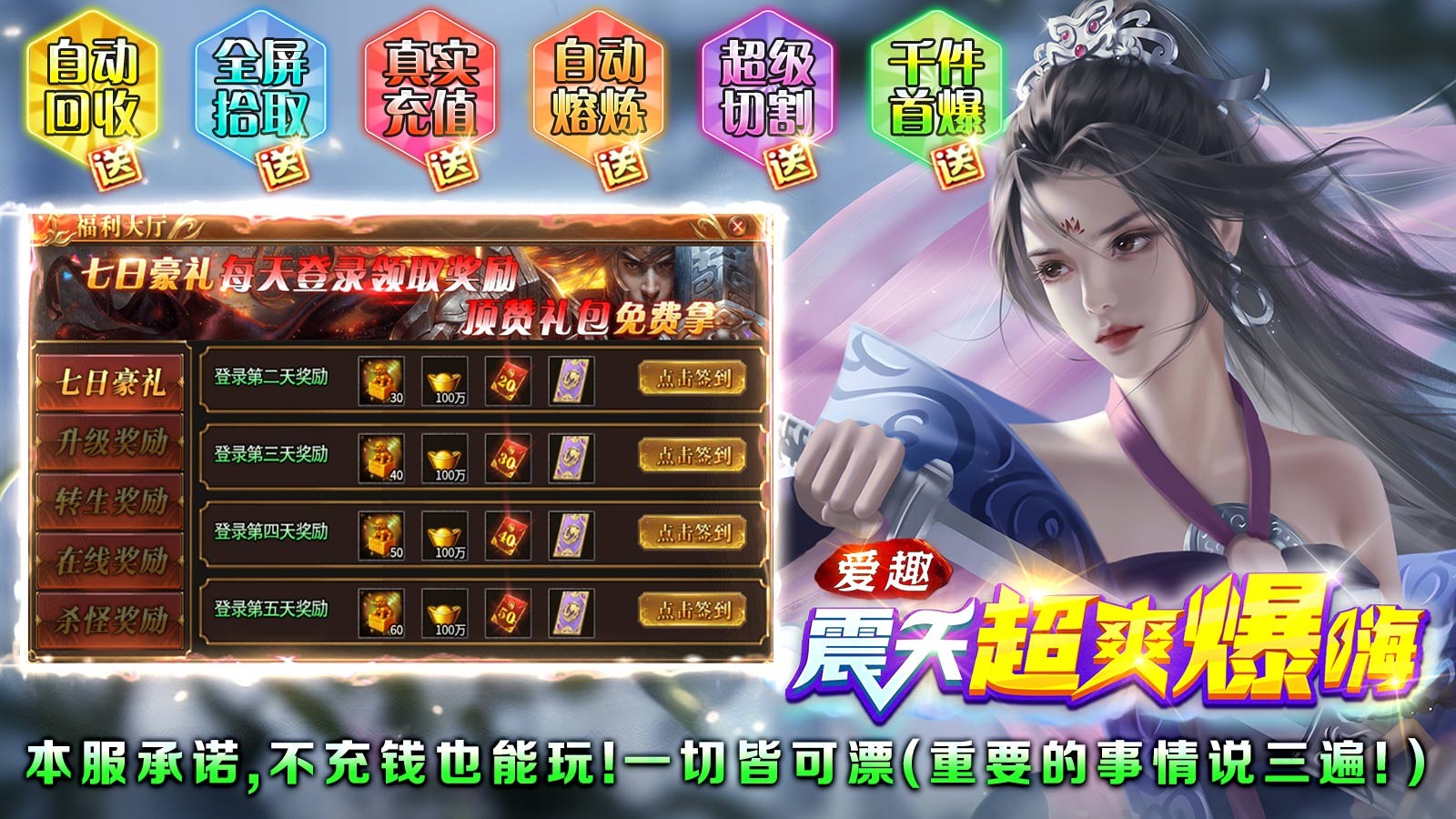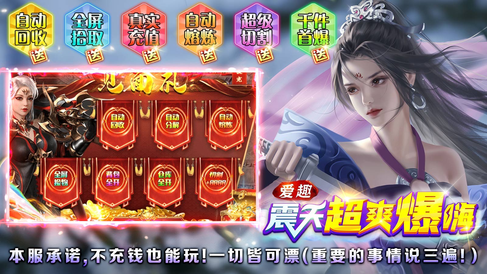 爱趣震天超爽爆嗨是一款超变无限刀传奇手游,在爱趣震天超爽爆嗨中,玩家上线就送自动回收、自动拾取、自动熔炼,背包、仓库全开,还有顶赞、冠名、VIP全都靠打,每日签到送充值,所有装备全靠打